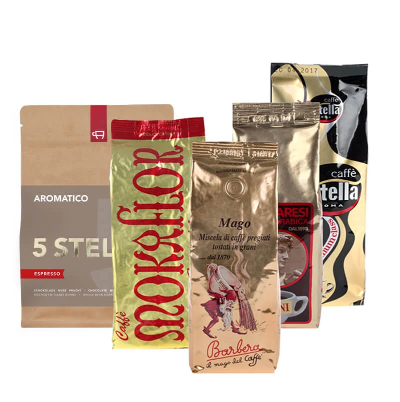 Wir haben für Sie ein Probierpaket der besten Kaffees zusammengestellt. Diese Kaffees überzeugen vorallem sehr durch einen vollmundigen Geschmack und schokoladigen Noten.Das Probierpaket besteht aus: Barbera Mago 250g ganze Bohnen, Mokaflor Miscela Oro 250g ganze Bohnen, Manaresi Miscela Oro 250g ganze Bohnen, Aromatico 5 Stelle 250g ganze Bohnen, Martella Maximum Class 250g ganze Bohnen