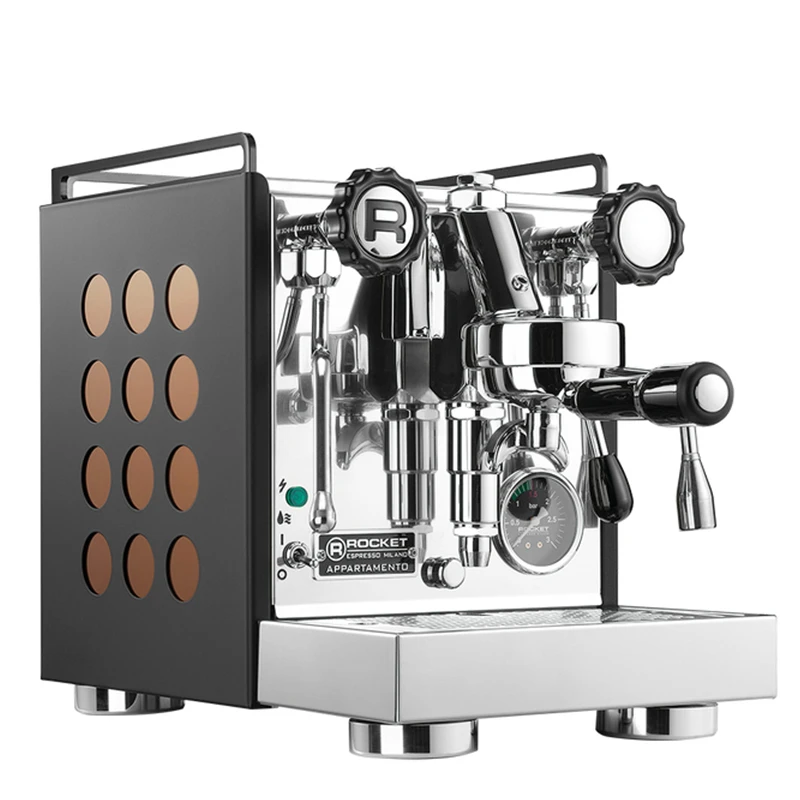 Die Appartamento Siebträgermaschine des Qualitätsherstellers Rocket eignet sich für jeden, der viel Freude an der Zubereitung italienischer Kaffeespezialitäten, dabei jedoch nur wenig Platz in der heimischen Küche hat. Die klassisch gestaltete Maschine fällt durch die runden Ausschnitte an der Seite auf. In der Black Copper Variante sind diese Kupferfarben, sodass sie sich von den schwarzen Außenwänden absetzen und der Maschine ein äußerst edles Design verleihen. Die Front der Siebträgermaschine selbst ist dabei im klassischen Rocket Stil gehalten. Dank der großen Drehventile im Rocket Design, der no-burn-Dampflanze, sowie dem massiven Siebträgerhalter macht die Appartamento einen äußerst professionellen Eindruck. Den letzten Feinschliff des Designs und der Benutzerfreundlichkeit bilden das Kesselmanometer, sowie der Bezugshebel aus Edelstahl.