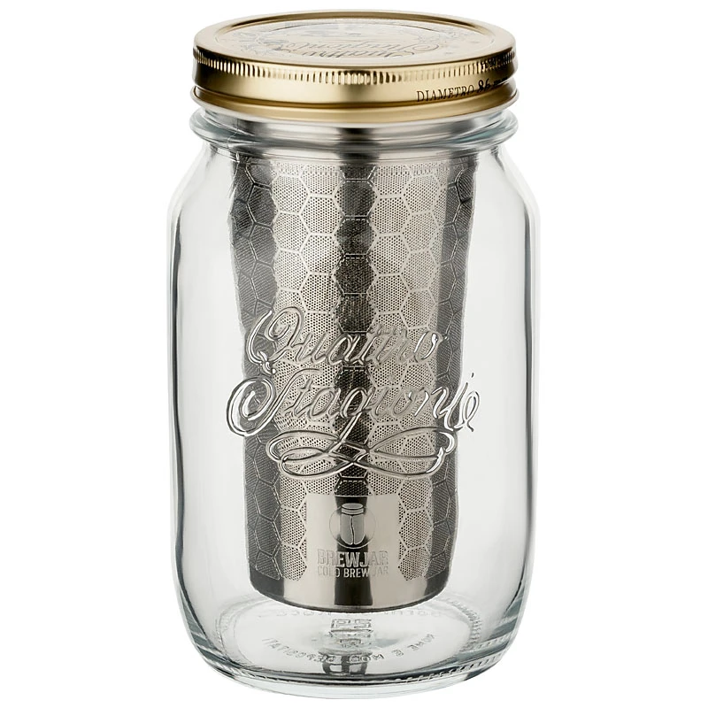 Mit dem Cold Brew Jar ist es ein Kinderspiel besonders klaren und leckeren Cold Brew Coffee zuzubereiten. Das robuste und hochwertige Quattro Stagioni Glas hat ein Fassungsvolumen von 1 L, verschließt ihren Cold Brew zuverlässig und lässt sich einfach im Kühlschrank verstauen. Der doppellagige Edelstahlfilter ist das Kernstück des Cold Brew Jars. Die eine Lage Edelstahl sorgt für die Stabilität und Langlebigkeit, die feine zweite Weblage ist ultrafein und sorgt für ein besonders feines Geschmackserlebnis ohne jegliche Sedimente. Das Glas wird durch den Deckel luftdicht verschlossen und kann für eine bessere Extraktion geschüttelt werden. Außerdem lässt sich das Glas ohne Auslaufen transportieren und kann im Sommer z.B. mit zum Badesee genommen werden. Der Brühvorgang erfolgt nach der Full Immersion Methode. Zur Zubereitung befüllen Sie das Glas mit Wasser und anschließend den Filter mit frisch gemahlenem Kaffee. Danach setzen Sie den Filter vorsichtig in das Glas ein, schrauben den Deckel drauf und stellen das Glas für 16 bis 24 Stunden in den Kühlschrank. Fertig!