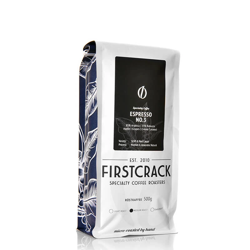 Der Espresso No. 3 von FIRSTCRACK Roastery ist eine Specialty Coffee Mischung aus zwei verschiedenen Sorten von Arabica Bohnen. Diese wurden medium geröstet. Es handelt sich um die beiden Varietäten SLN9 aus Indien und Red Catuai aus Myanmar. Washed sowie anaerobic natural wurden die Bohnen aufbereitet. Die Berliner Kaffeerästerei FIRSTCRACK Roastery ist eine absolute Specialty Coffee Rösterei, deren Blends feinste Kaffeekunst sind!