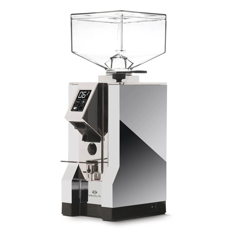 Die Variante Specialita steckt im typischen Mignon-Gehäuse mit kantigem Design und eckigem Bohnenbehälter. Mit der geradlinigen Designsprache macht Eureka deutlich, dass die Mühle nicht zweitrangig nach der Siebträgermaschine steht, sondern beide Maschinen auf Augenhöhe miteinander harmonieren. Mit ihrem verchromten Gehäuse und Auswurf passt die Mignon Specialita gut zu klassischen und modernen Siebträgermaschinen. Im Inneren treibt ein 260 Watt starker Motor mit 1350 Umdrehungen in der Minute das 55 mm Scheibenmahlwerk an. Die Größe der Mahlscheiben sorgt dafür, dass das Mahlen, trotz der vergleichsweise geringen Drehzahl, schnell geht. Die Drehzahl und Eurekas Silent-Technologie wiederum sorgen dafür, dass die Mühle trotz ihrer Leistung erstaunlich leise bleibt.
