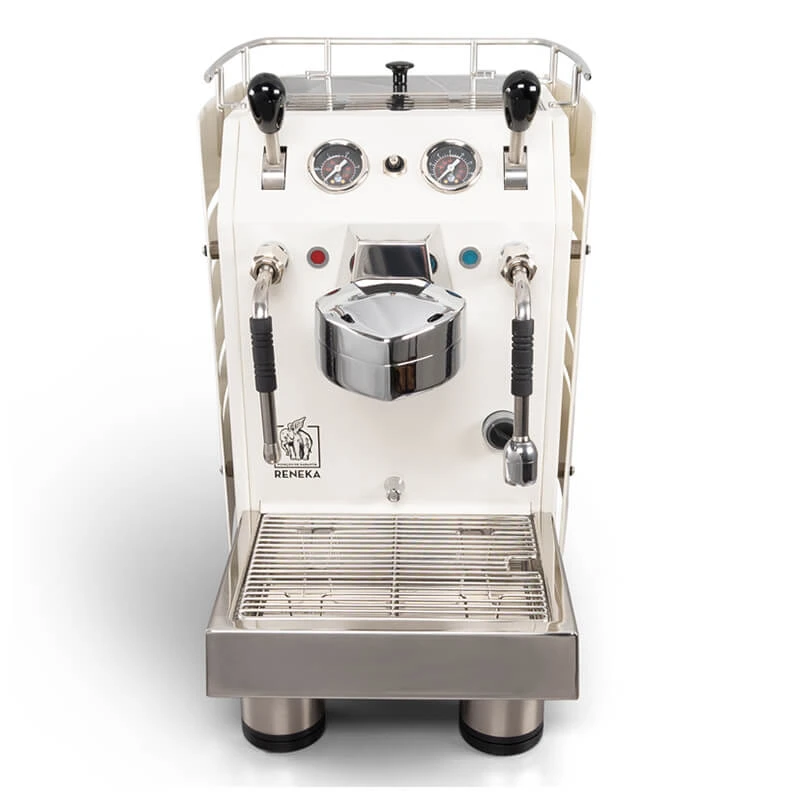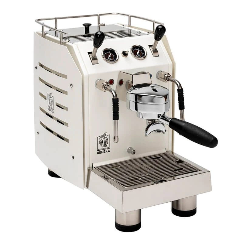 Die Reneka Family Home 1G ist eine wirklich einzigartige Siebträgermaschine, die sich in einigen Punkten von vergleichbaren Maschinen absetzt. Zunächst fällt ihr edles Design, entworfen von Alexander Schulz, ins Auge. Die aufgesetzten Seitenpanels, die großen Füße und vor allem die Hebel und Manometer an der abgeschrägten Bedienleiste hinterlassen einen prestigeträchtigen Eindruck. Besonders die Hebel und Instrumente im Zusammenspiel mit der Reling an der Tassenablage erinnern an eine Motoryacht. Die große technische Besonderheit liegt jedoch in der Aroma-Perfect-Brühgruppe mit automatischem Tamping.