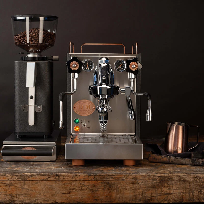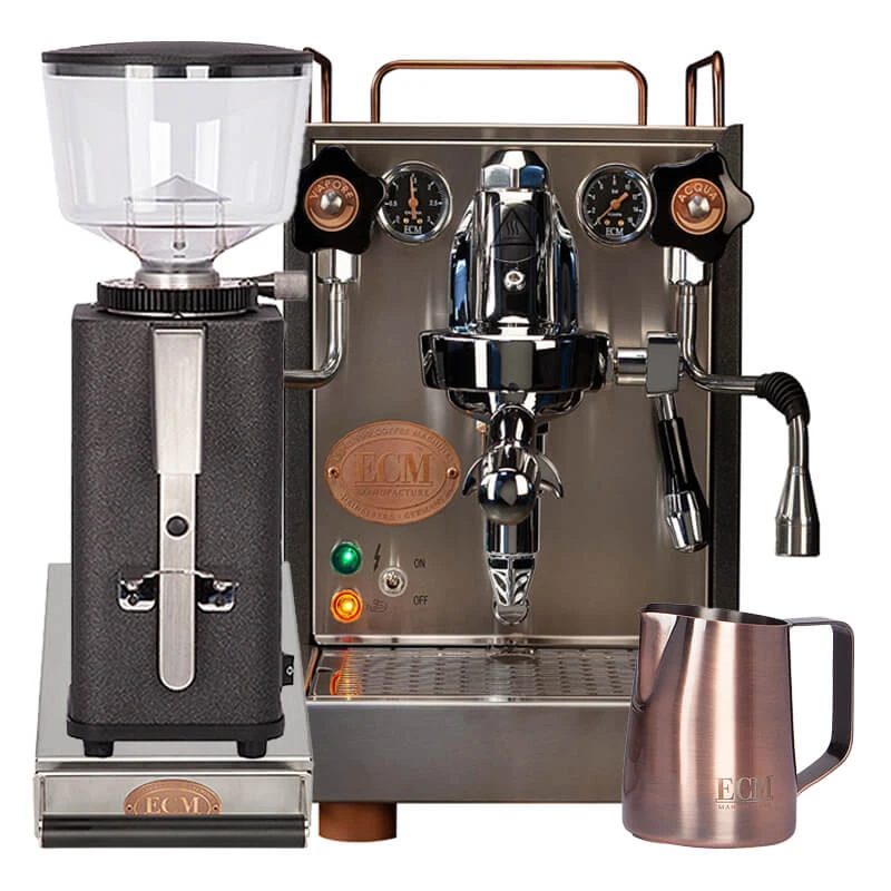 Dieses Bundle ist durch die Heritage Linie ein ganz besonderer Hingucker für Heimbaristas. Im edlen Kupfer Look bekommen Sie die ECM Mechanika VI Slim, die ECM S-Manuale 64, sowie das passende Zubehör von ECM in Form einer Sudschublade und eines Milchkännchens.