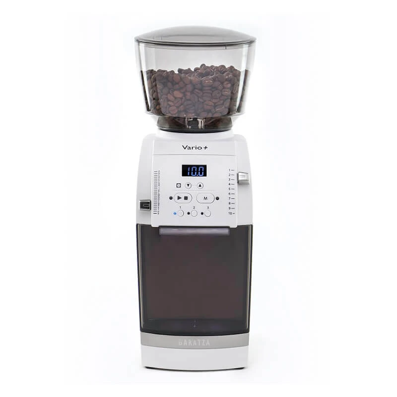 Die beliebte Kaffeemühle von Baratza hat mit der Vario+ Version eine verbesserte Variante erhalten. Vorher als „Mahlkönig Vario“ vertrieben, kommt diese nun als Vario+ Modell auf den Markt. Unverzichtbare Kaffeemühle mit vielen Features. Zu den verbesserten Komponenten gehört unter anderem der Bohnenbehälter aus der Forté-Reihe, dieser besitzt einen Schließmechanismus. Die Vario+ besticht durch das qualitative Mahlergebnis. Das Bedienfeld und Display hat ebenso einen verbesserten Look. Ein Hingucker ist zudem die strahlende LED-Beleuchtung am Auswurfbereich. Variablen bietet die Baratza Vario+ mit den Möglichkeiten, entweder den mitgelieferten Behälter zu nutzen, dieser kann unter den Auswurf eingesetzt werden. Oder aber der integrierte Siebträgerhalter mit Blende kann genutzt werden. Eine Kaffeemühle mit vielen Möglichkeiten.